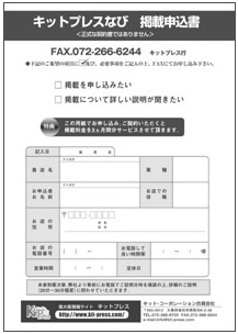 左の用紙で「キットプレスなび」にお申込み頂くだけで、なんと掲載料金が3か月間も無料サービスになります!