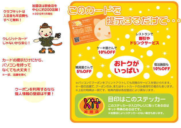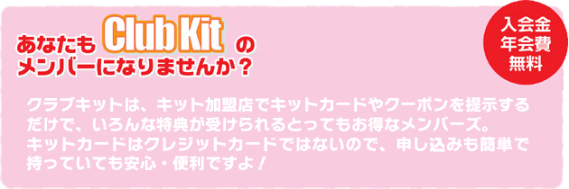 「クラブキット」はキットプレスの読者を中心とした『得する』ことが大好きな人たちの為のメンバーズ。クラブキットの加盟店で、当メンバーズの会員証であるキットカードを提示、またはキットプレスeクーポン(プリントアウト)を渡すだけでいろんな特典を受けることができます。