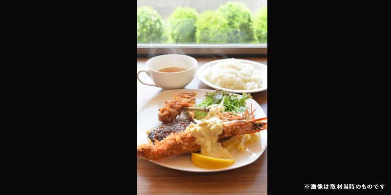 壁一面のガラス窓。眺めの良さに感動する。料理は、一つひとつ手仕込みにこだわり、栄養バランスの取れた一汁三菜の「週替わりランチ」、「和牛すじ肉のスパイスカレー」のじっくり煮込まれたすじ肉はとろける柔らかさ。香り高いスパイスとフルーティーな甘みがうまさを引き立てる。土曜日はA5ランクの和牛を使ったハンバーグなどもメニューに加わり好評。